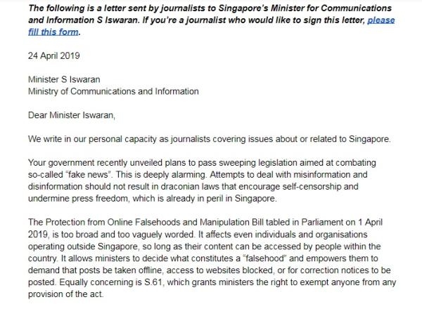 A group of journalists have written a letter to Minister of Communications and Information, S Iswaran, to request him to withdraw the Protection from Online Falsehoods and Manipulation Bill.