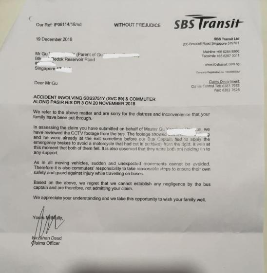 Instead of apologising for what happened, SBS Transit rejected the man's claim by saying that there is no evidence showing the bus driver's negligence. It reviewed CCTV footage and blamed it on the mother and son for not holding on to the support bars when the bus braked.