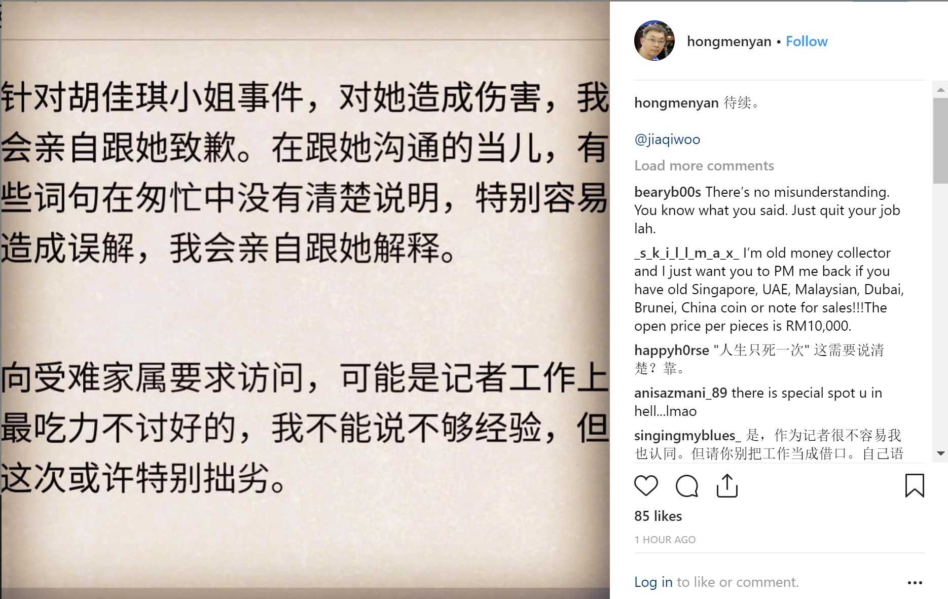 The screenshot of it went viral on social media after local actress Hayley Woo posted it on her Instagram profile. On 25 January 2019, the supposed journalist who sent the messages admitted his mistake on two Instagram posts. Here is the first: